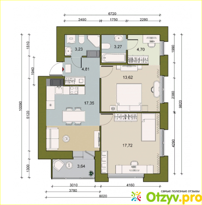Насчет квартиры хочется рассказать отдельно: здесь широкий выбор различного метража жилья, поэтому можно выбрать как однокомнатные, так и двухкомнатные, трехкомнатные. Мы выбрали двухкомнатную квартиру общей площадью в 66,52 кв. м. Из них кухня получается 17,35 кв. м., гостиная —17,72 кв. м; спальня –13,62 кв. м; лоджия примерно 3,6 кв. м, санузел №1 –3,23 кв. м; санузел №2 –3,24 кв. м; прихожая –4,7 кв. м. Этаж 9 из имеющихся 9; вид у нас из окна сразу же на внутренний дворик. Два санузла, лоджия, на момент покупки она стоила 9 миллионов рублей. Не такие уже большие деньги для Питера, даже если дом находится в поселке, цена полностью оправдывается.
