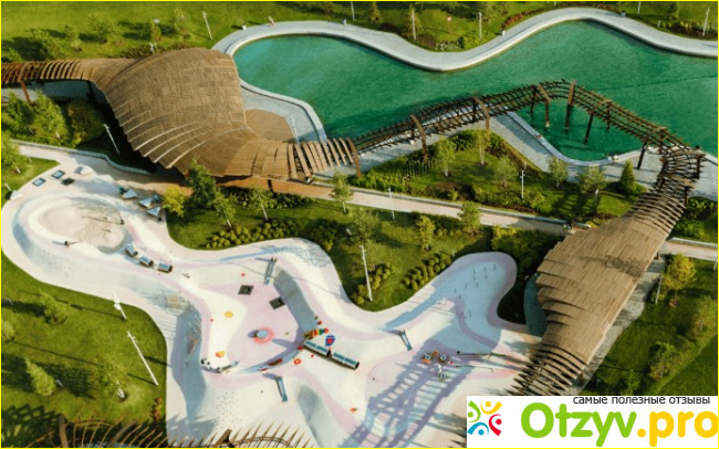Комплекс раскинулся действительно в уникальном для столицы месте, где имеется даже свой парк на 10 гектарах. Он уже засажен множеством деревьев и кустарников, а также большим количеством цветников. Имеет своя уникальная смотровая площадка и небольшой пруд с чистой водой, которая остается такой благодаря многоуровневой очистке. Там же есть детская площадка с аттракционами, горками и каруселями. Не забыли и про взрослых, для которых есть места, где они могут заняться волейболом, бадминтоном, теннисом и другими видами спорта.