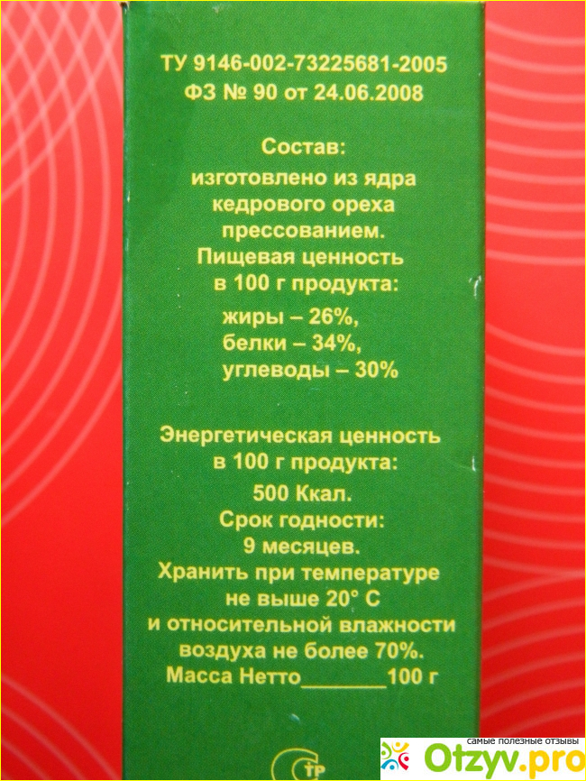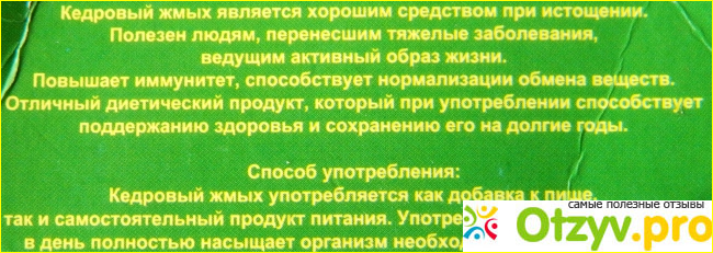 На коробке написано также о том, какую пользу приносит организму употребление кедрового жмыха.