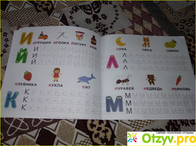 Что мне понравилось здесь, так это красочное оформление каждой буковки. Помимо изображения самой буквы, присутствуют ещё и картиночки, на которых очень качественно и красиво нарисованы те предметы, которые начинаются на определённую буковку. Места для тренировки письма здесь в тетрадочке также предостаточно. В общем, если бы не непривычные для меня угловатые буквы, я была бы от данной тетради-прописи в полнейшем восторге. но всё же мне данное издание очень понравилось.