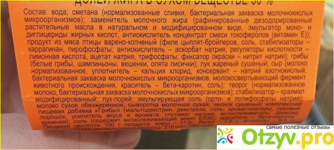 Сам продукт сделан из сметаны, сыра и творога, а так же грибов (лисички, опята, вешенки) и мяса птицы, плюс добавлен сюда и лук. В разогретом виде все выглядит как настоящий жюльен, по вкусу тоже похож. С подробным составом можете ознакомиться ниже: