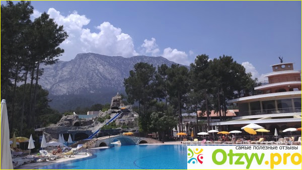 рядом с отелем расположен открытый очень большой бассейн с разной глубиной, есть как взрослый так и детский. В бассейн выходят горки из аквапарка, что очень забавляет детей среднего возраста, но так же и взрослых. рядом с бассейном есть та же небольшой мини - бар, где можно взять охладительные напитки, ведь на улице очень жарко и при купании хочется пить.
