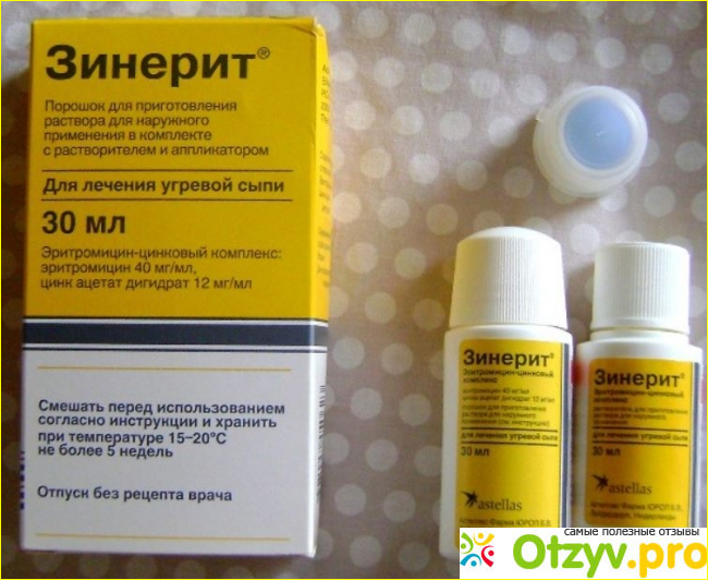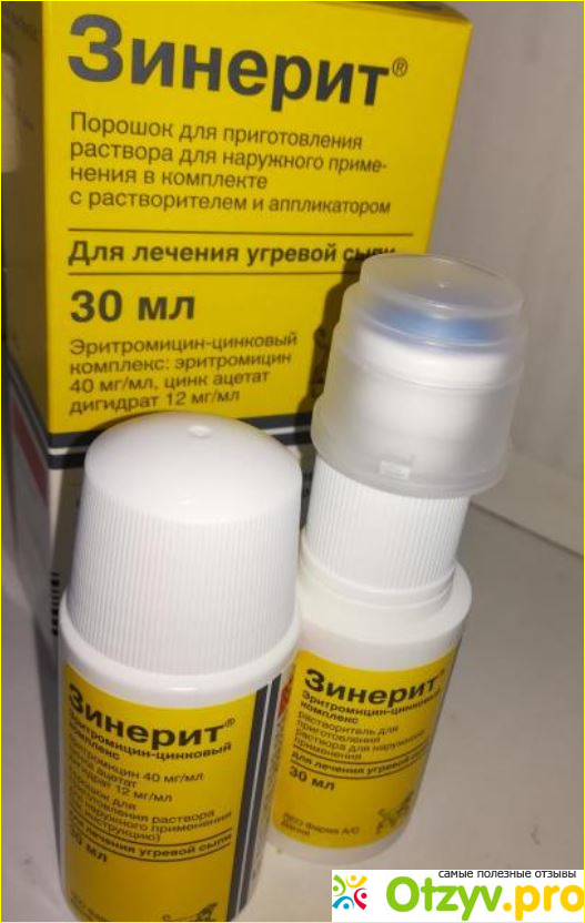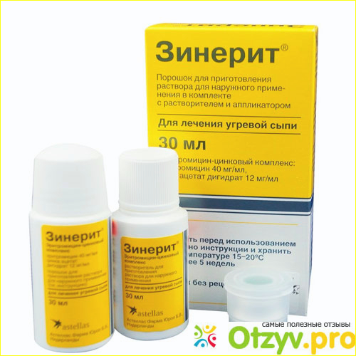 Зинерит представляет собой эффективный лосьон, который помогает от прыщей, в нем содержится антибиотик, который способствует избавлению от бактерий, способствующих появлению прыщей. Благодаря наличию ацетата цинка кожа сокращается и более быстро заживает после того, как прыщи появляются.