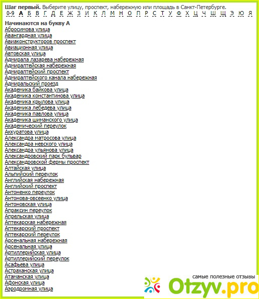 При этом посетителям предлагается два варианта использования поиск-системы - через поисковую систему Яндекс или по каталогу улиц и переулков, проспектов и площадей, домов и их корпусов. Это уже, кому как удобнее пользоваться, к ток чему больше привык на практике. Лично я, честно признаваясь, ни разу до сего момента не имел чести воспользоваться ни тем, ни другим. Но точно могу сказать, что второй гораздо удобнее для тех индивидуумов, которые не достаточно хорошо учились в средних учебных заведениях и, соответственно, не запомнили ни одной набережной на реке Неве. Ведь можно элементарно поискать по алфавитному списку - отдельно по каждой заглавной букве от "А" до "Я".