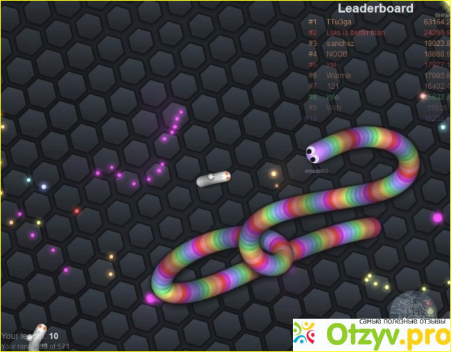 Вам нужно зарегистрироваться в игре придумать себе имя (ник) и выступать на игровом поле. Нужно съедать светящиеся большие и малые точки для увеличения своей силы и обходить прямого столкновения с вашими врагами. А для того, чтобы уничтожить соперника, нужно хитростью обмануть его. Попробуйте сделать один маневр, в результате которого, враг врежется в тело вашей змеи и разлетится от столкновения на много толстых точек. Вот эти точки как раз нужно быстро съесть для того, чтобы увеличить свой рост и силу.