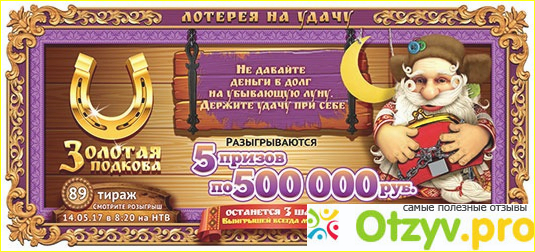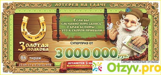 Ну что сказать об игре Золотая подкова. Лично я временами играю в нее уже некоторое время, покупаю за один раз максимум 3 билета ( на 300) рублей, и за все время пару раз у меня получалось выиграть те же 100 рублей обратно. То есть, не сказать, что лотерея совершенно не дает ни чего выиграть. Но вот на счет крупных выигрышей. Тут или народ молчит, не хочет о своем богатстве говорить, или их просто нет.