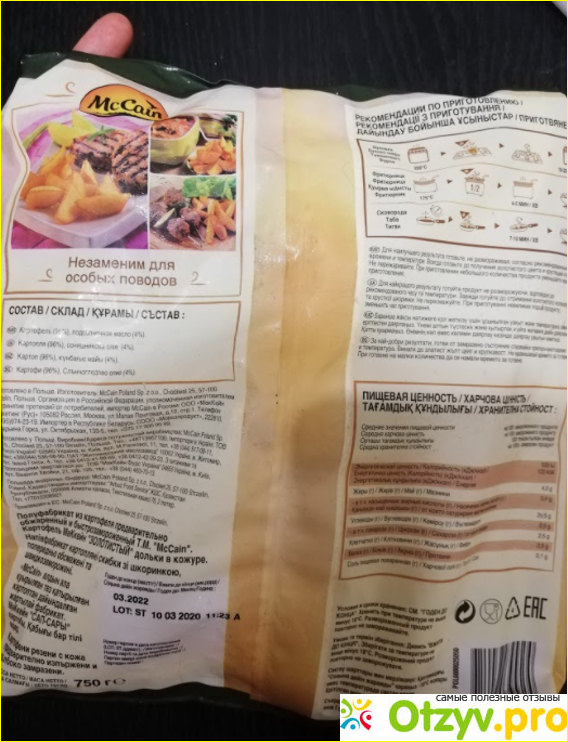 Упаковка выглядит аппетитно. В ней – уже готовый жареный картофель. Только разогреть, и все. Не надо ни чистить, ни мыть. Вроде все, как надо.