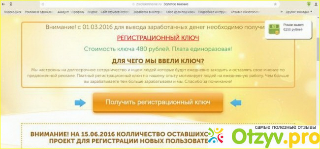 Итак "Золотое мнение" предлагает народу просматривать рекламу в ненапряжном режиме ( но не менее 30 роликов в день), и высказывать о ней свое мнение. При этот обещается заплатить аж по 250 рублей за 1 просмотр. Ролики короткие, за час можно столько насмотреть. У нас нет такой оплаты почасовой даже у жриц любви, если только очень элитных. Естественно, это вовсе не забота о том, что вы сидите без денег, это продуманный ход, чтобы пробудить в вас азарт и вы никуда не делись от монитора. Соблазн очень велик - просмотрел ролики и в легкую заработал до 7 500. В день... не в месяц. А 7 500 - это оклад помощника воспитателя ( нянечки) в детском саду. А тут вот за час -другой и все. Так что - такие цены и заработки сродни той самой песенке из мультика "Оставайся, мальчик, с нами Будешь нашим королем".