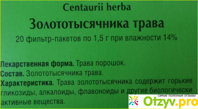 Мне, например больше нравится вариант, уже расфасованный по пакетикам. Продаётся травка в удлиненной крупной коробке, где располагается 20 небольших пакетиков по полтора грамма травы золототысячника в каждом. Стоит такая коробка 149 р. На коробки сразу можно увидеть цветущую траву этого растения и крупную надпись "Золототысячника трава" с количеством 20 фильтр-пакетов, также здесь приводится наименование этого растения по латыни. Производит эту траву предприятие АО "Красногорсклексредства", крупный логотип которого также красуются на самой коробке.
