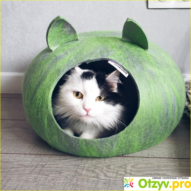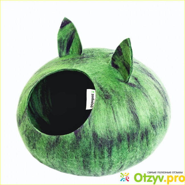 Недавно, в поисках очередного домика я нашла валяный домик слиппер с ушками для собак и кошек от Зообалу. По размерам на среднюю кошку 40*40*20 см. Стоит такое удовольствие 2300 рублей. Внешне выполнен в виде кошачьей головы с ушками и круглым отверствием для входа животного. Производитенль предлагает несколько видов цветов, я взяла травянисто зеленый. Такой домик очень красиво смотрится рядом с напольным цветочным горшком и растением схожего цвета. Шерсть использована в двух оттенках, это очень красивый меланжевый эффект. При необходимости производитель допускает возможность сухой чистки своего изделия.