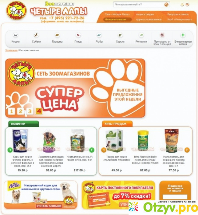 Лично в моем городе в нескольких торговых центрах есть такой зоомагазин, который называется Четыре лапы. По этому если вы находитесь рядом с ним, то можно покупать конечно же товары непосредственно в нем. Но лично для меня удобнее и даже иногда выгоднее покупать товары именно в их интернет-магазине.