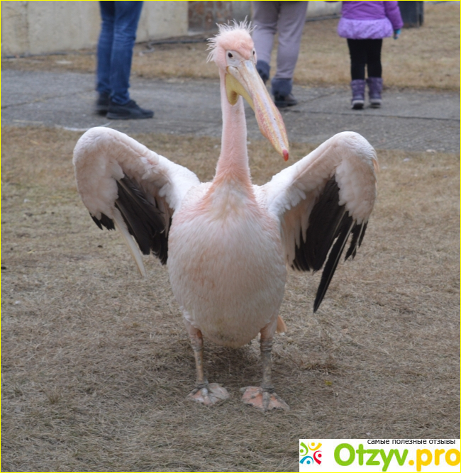 По территории ходил розовый пеликан. Попали на кормление птицы рыбой.