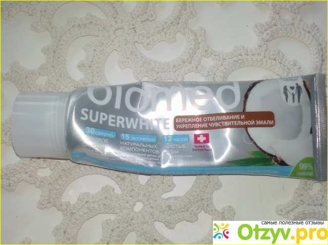 Производитель много чего пишет о пасте. Во-первых она содержит масло кокоса. Это чувствуется хорошо конечно. Паста приятно пахнет кокосом и чем-то легким освежающим. Так же он обещает, что товар отбеливает зубы, укрепляет эмаль. Если честно, то ни одно из обещаний я так и не смогла увидеть. Зубы белее не стали, а эмаль и так не страдала вроде бы.