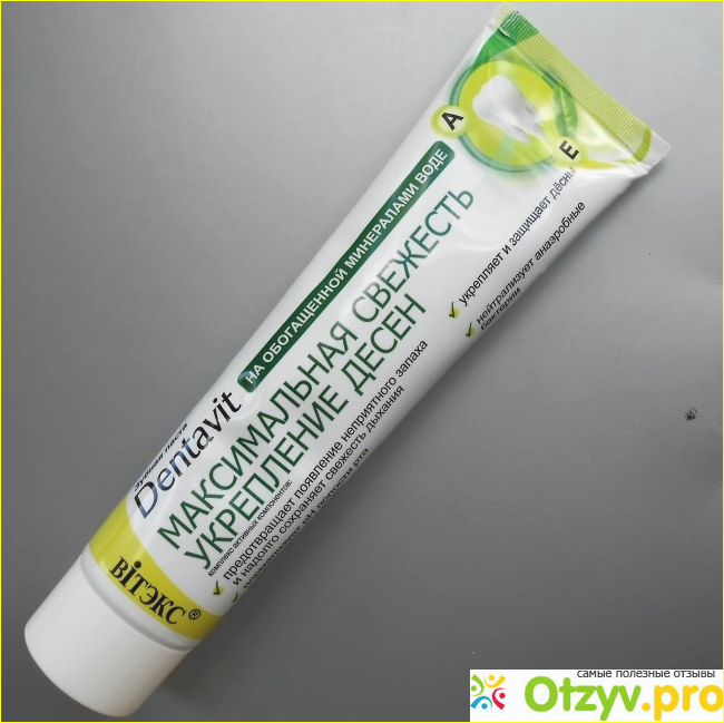 Зубная паста Dentavit, произведенная на основе обогащенной минералами воде и содержащая витамины А и Е, как раз обещала придать свежесть дыханию и укрепить десны. Тюбик с этой пастой достаточно большой, в нем 160 г, так что ей можно было длительно пользоваться всей семьей, решить свои проблемы в полости рта, да еще и сэкономить. 115 рублей для такого большого тюбика -- это совсем не дорого.