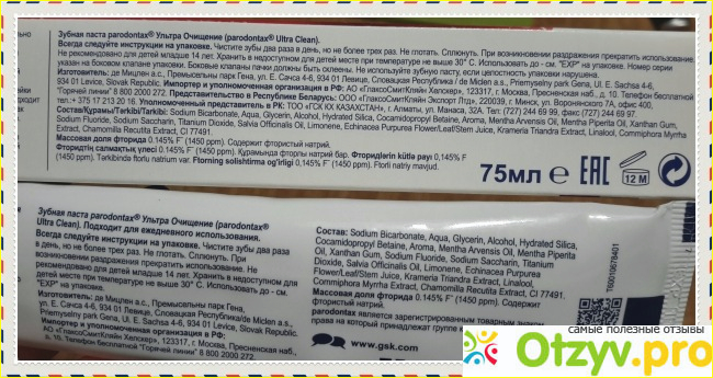 Тюбик уложен в картонную коробку, которая плотно заклеена. Производится такая паста в Словацкой Республике. Номинальный объём такого тюбика 75 миллилитров. На упаковке указан и состав этого средства.