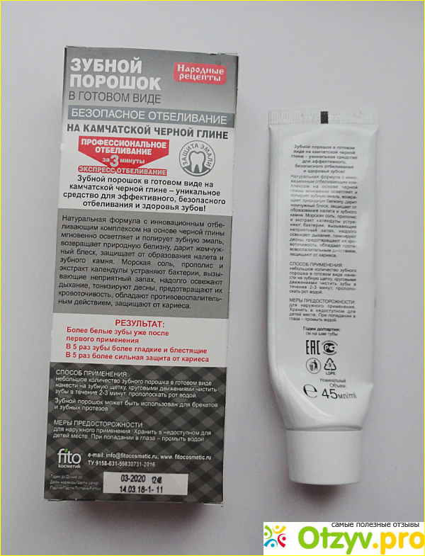 Периодически чередуя зубные пасты с порошковыми средствами для отбеливания, я увидела в аптеке за 54 рубля новый для себя продукт: зубной порошок в готовом виде "Народные рецепты" на камчатской черной глине. После использования продукта у меня сложилось, двоякое впечатление.