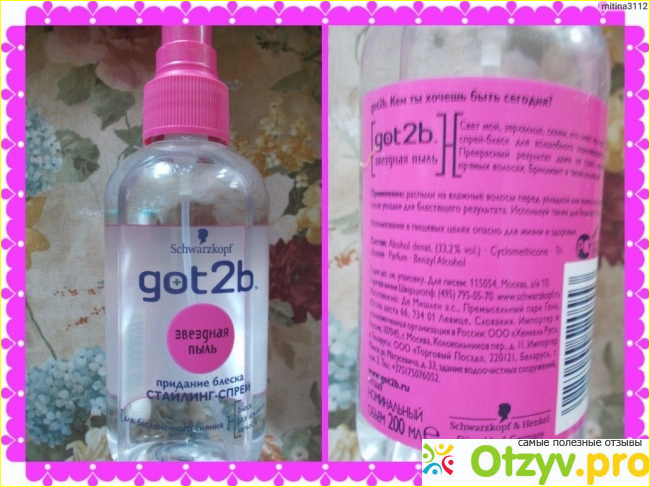 Замечательное средство Звездная пыль или стойкий стайлинг-спрей Got2b для придания блеска от компании Schwarzkopf попробовала несколько лет назад, но до сих пор продолжаю покупать с периодической регулярностью. Стайлинговое средство весьма практично в применении, не склеивает волосы, но при этом отличается приличной стойкостью.